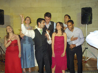 Bem aqui pode-se dizer que a noite foi longa. Tivemos para já um lugar de destaque, a nossa mesa era mesmo em frente à dos noivos e se olhassem para a mesa mais a meio da noite já não havia muito espaço, isto porque abundavam os copos e garrafas (tudo cheio claro). Assim foi dançar e cantar a noite toda. Começando pelos “Loucos de Lisboa”, passando pelo “Engenharia” e terminando no hino nacional.
